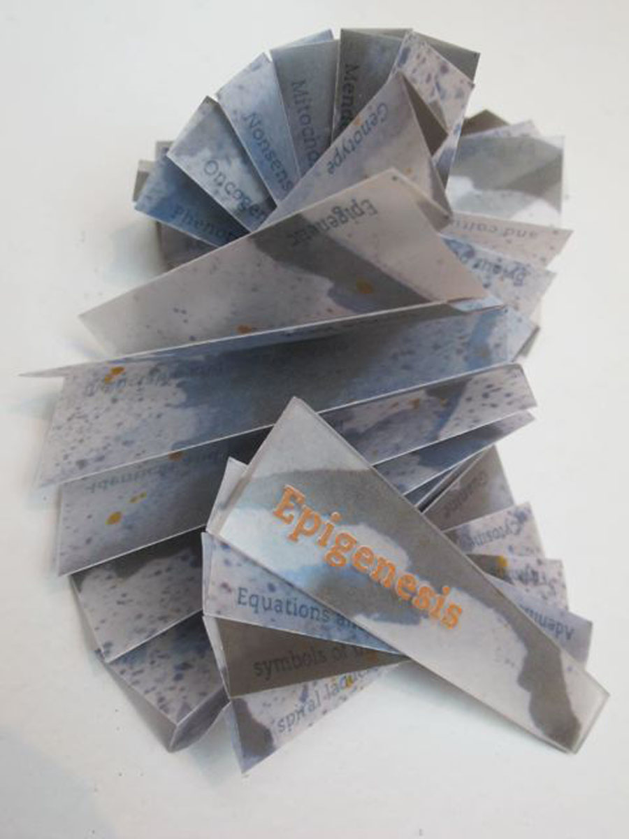 ±OnePercent is a collaborative artists' book exploration of the duplicative, and yet wildly variant, nature of heredity and the human genetic code. The book, created by 8 graduate students under Marginalia Press, the press of the MA Art and the Book program at the Corcoran College of Art + Design, is a work composed of three innovative books in a multi-layered, nested structure with traditional letterpress, as well as contemporary digital and collagraph printed imagery and text. The book is comprised of structures which follow an arc from traditional to modern to experimental: ancient Coptic, multi-faceted accordion/flag, and sculptural spiral, using mill-made and handmade papers, and cloth. Each structure in its own distinctive way works together with the others to explore the complex ties between human DNA, family relationships, individualism and identity.
